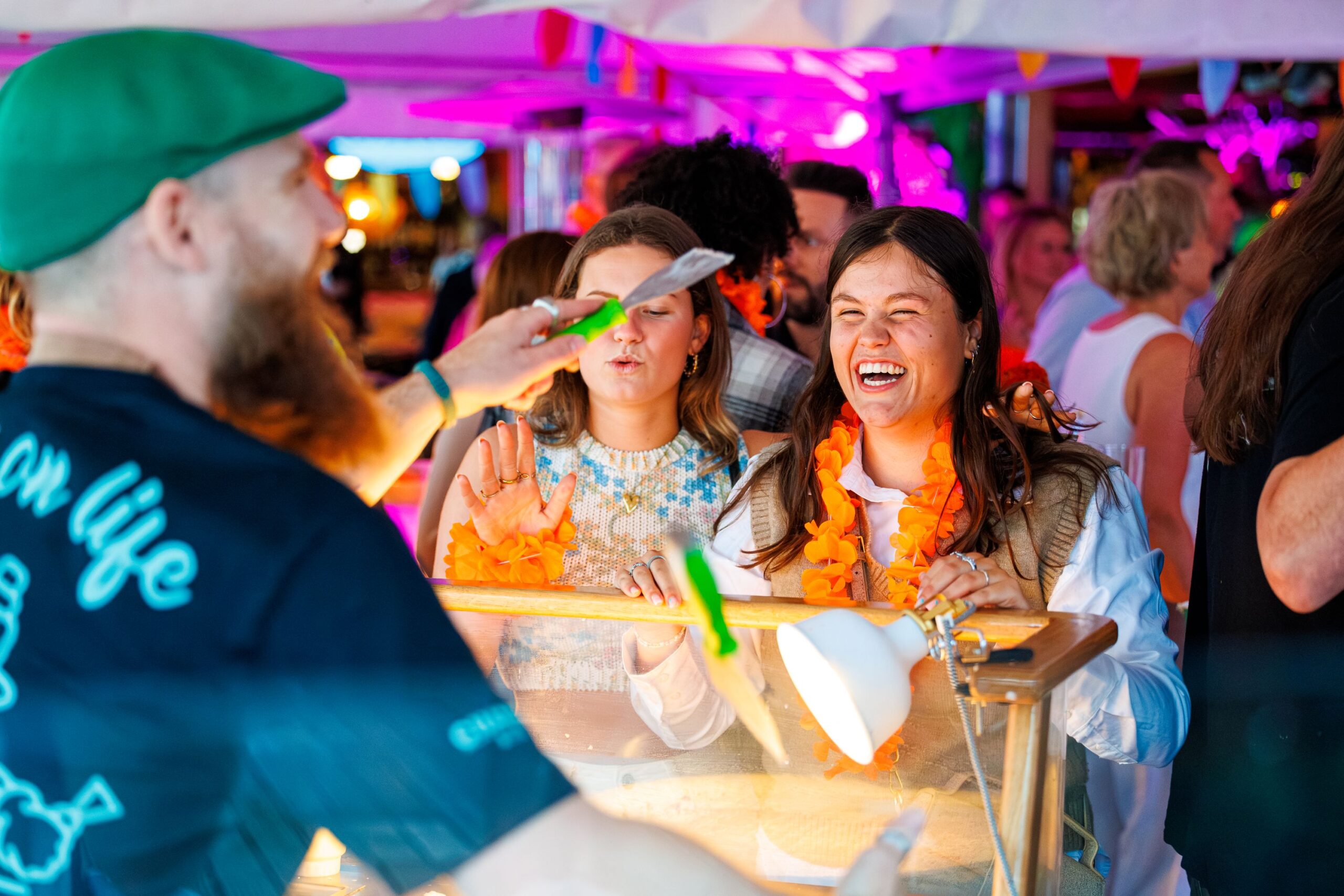 Onze polaroid-dames, gekleed in stijlvolle witte Ibiza-jurken, legden spontane herinneringen vast. Ondertussen werd er volop genoten bij de cocktailbar, waar bartenders met flair de ene zomerse creatie na de andere shaketen. De cocktails? Zonder twijfel favoriet deze avond.