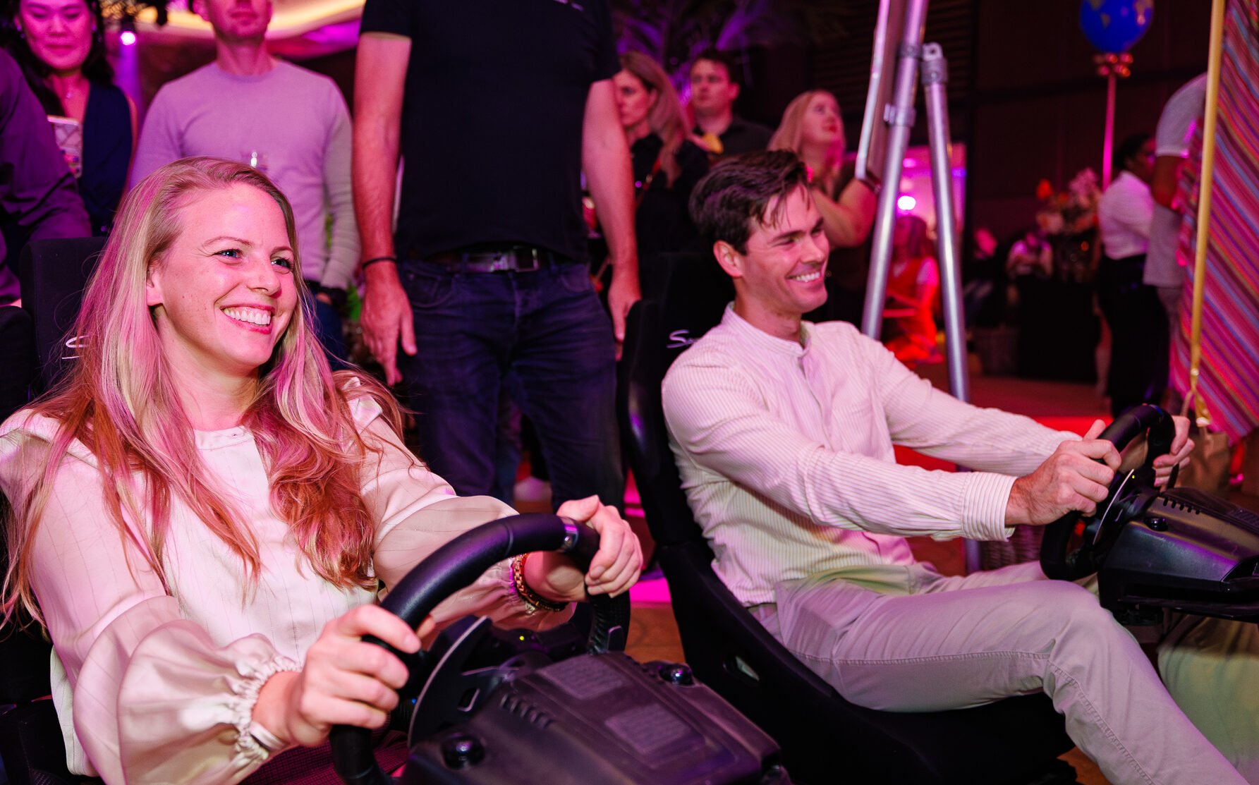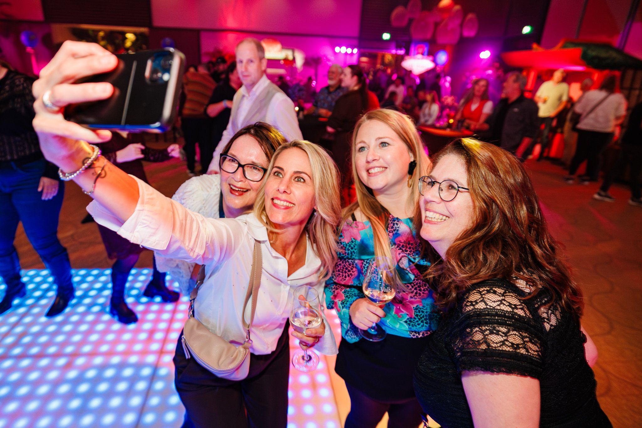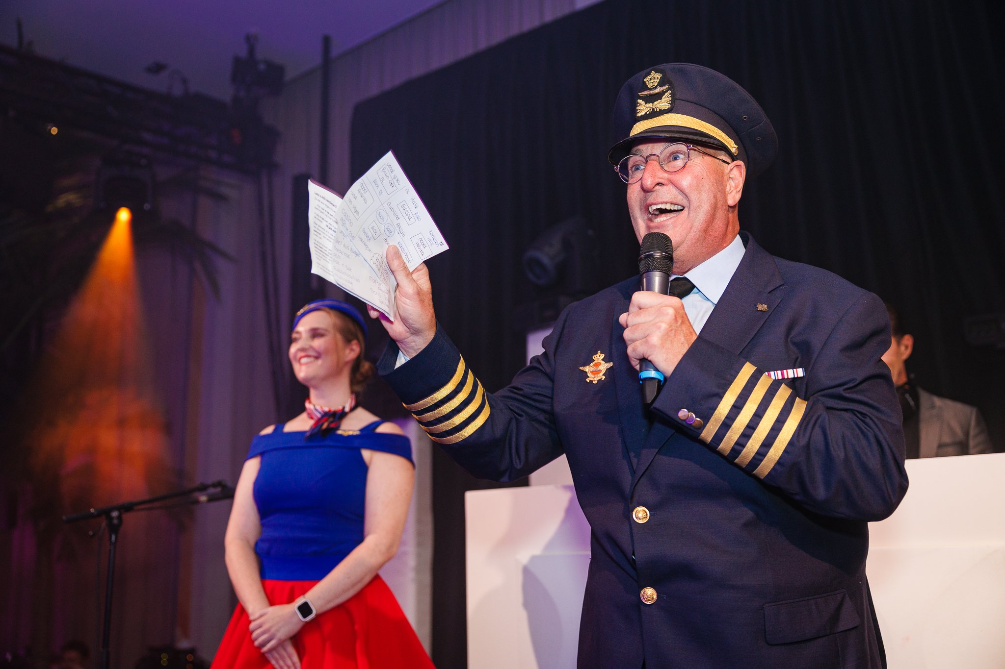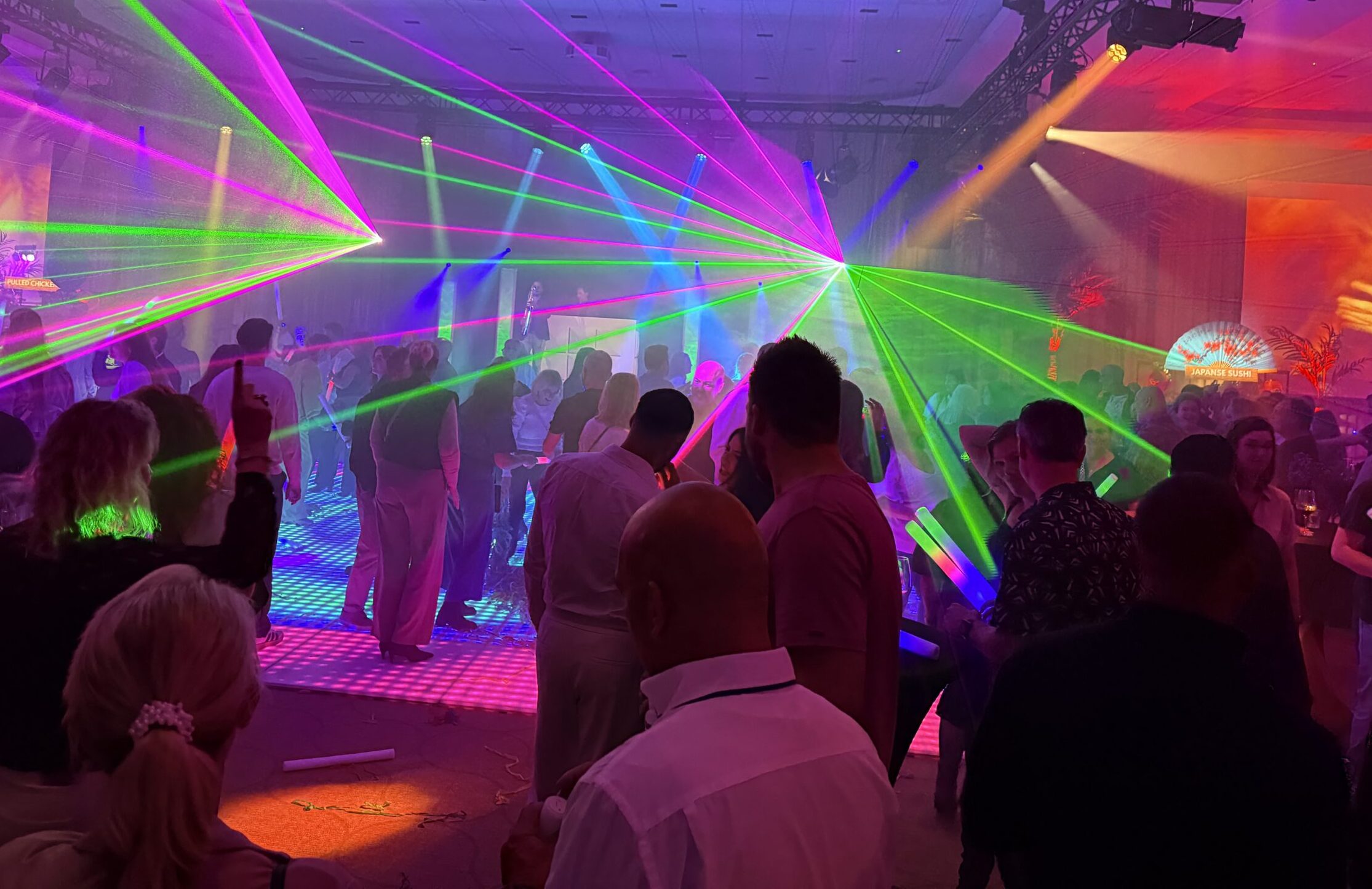In de hoofdzaal werd men als echte business class passagier ontvangen met een welkomstdrankje en bites. Vervolgens ging de avond van start met een gepersonaliseerde fullcolour lasershow met de titel “Together we are one!” Een spectaculaire aftrap van een geweldig feest met zes verschillende area’s.